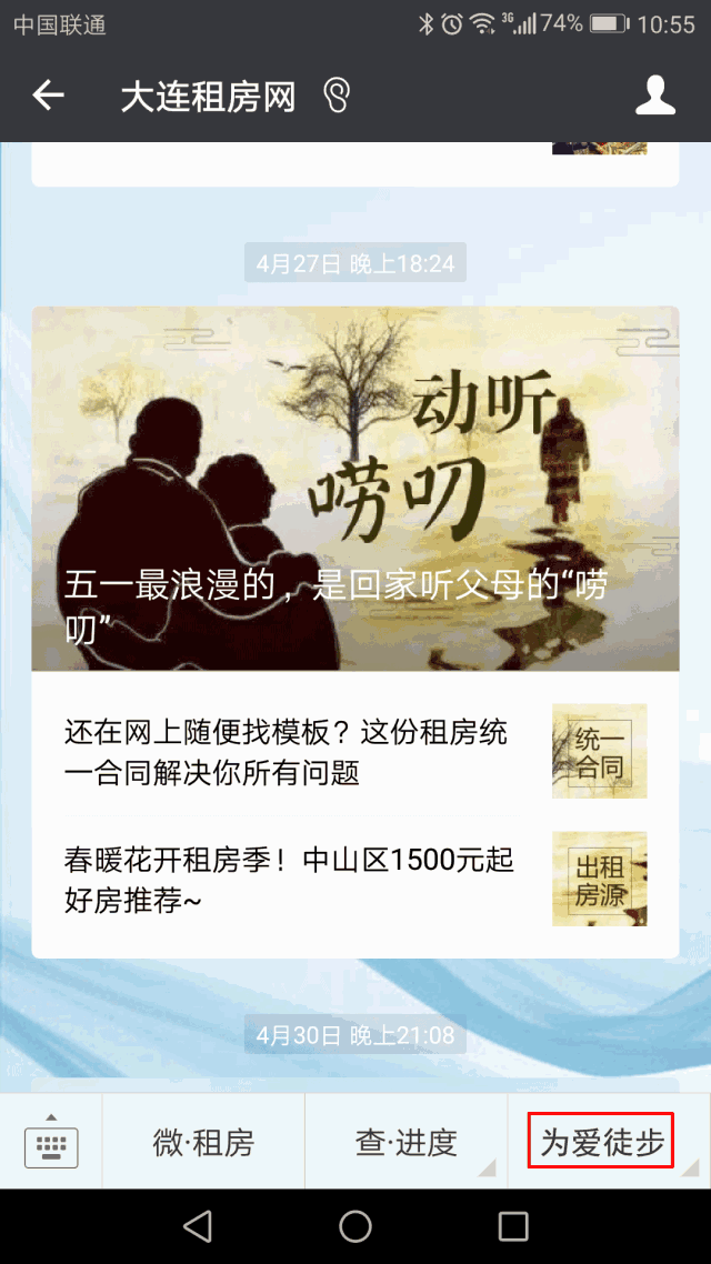 排名查詢:進入“大連租房網”微信公眾號點擊右下角“為愛徒步”中