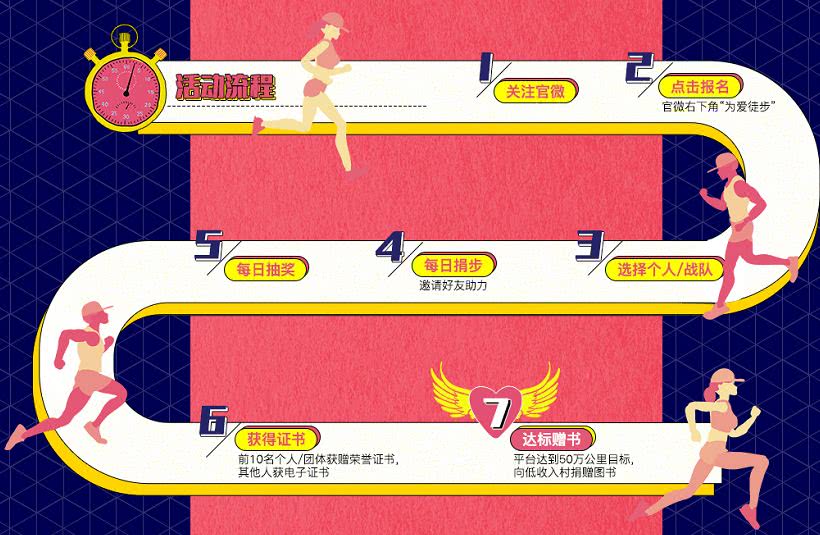 按照圖片流程,輕松報名參加,組團當團長,捐步獻愛心,抽取神秘獎,走出新高度