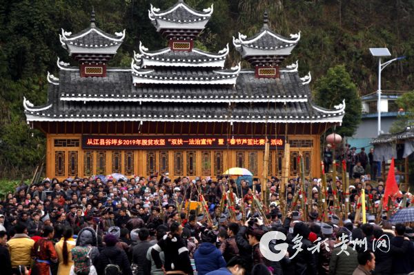 當(dāng)日中午,從江縣谷坪鄉(xiāng)周邊的往洞、斗里、雍里等鄉(xiāng)鎮(zhèn)和谷坪鄉(xiāng)本鄉(xiāng)各村的侗族、苗族等民族的30余支蘆笙隊(duì)上千人歡聚一堂,在谷坪鄉(xiāng)中心小學(xué)少年宮舞臺前的操場里進(jìn)行蘆笙吹奏表演、蘆笙比響等傳統(tǒng)民族民俗活動(dòng),慶祝新年到來。30多支蘆笙隊(duì)比賽誰吹得響,熱熱鬧鬧慶賀新春。蘆笙比響是當(dāng)?shù)貍鹘y(tǒng)文化活動(dòng),兩支蘆笙隊(duì)一對一比賽,裁判在1公里外的高處聽聲音,并以旗幟傳遞輸贏信息。