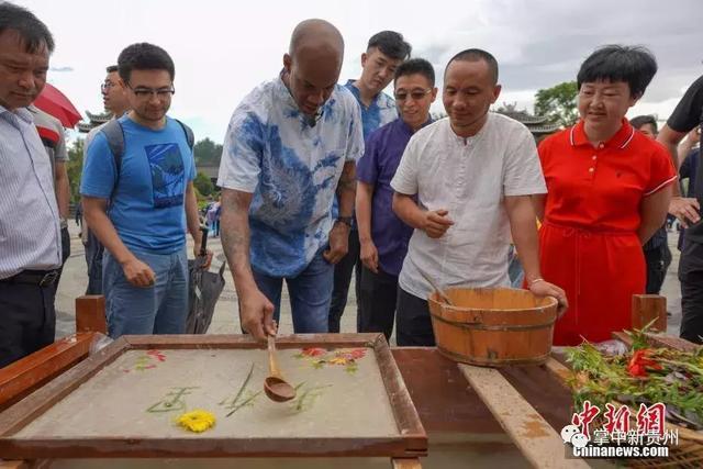 馬布里(左三)在貴州丹寨體驗非遺古法造紙技藝。賀俊怡 攝