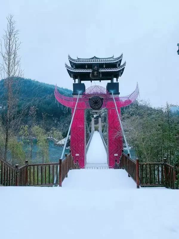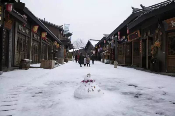 小鎮古樸屋頂換上一襲白衣。