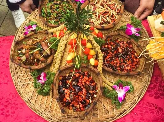 推薦理由:七彩姊妹飯是臺江、凱里一帶的苗族群眾過“姊妹節(jié)”時做的一種美食,每年農(nóng)歷三月十三日,苗寨的姊妹們都上山去采擷花草樹葉等,分別用冷水浸漬和用水煮的方法,制成黑、紅、黃、綠等各種顏色的汁液,然后用這些汁液分別浸泡糯米。然后將這些分別浸泡好各色糯米上甑蒸熟,就成了晶亮芬香的姊妹飯。姊妹飯不但色彩繽紛、芳香可口,還具有明目健身,滋補強身的功效,是節(jié)日期間與親朋好友共享或者相贈的特色食品。