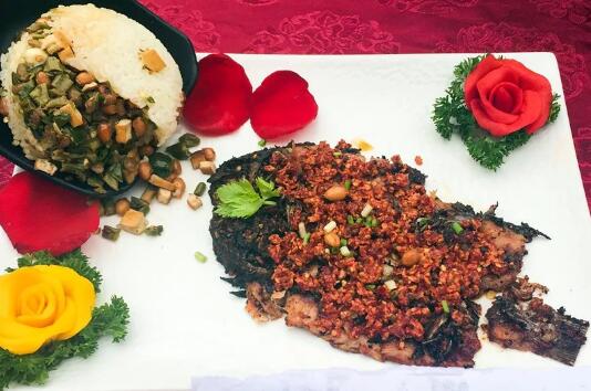 推薦理由:血漿鴨是當?shù)匾坏雷龇í毺氐募央,殺鴨時,先將鴨血流入醋加清水的菜碗里,使其血漿不致凝固,然后選用2公斤左右重量的本地仔鴨,將鴨子切成小塊,將鴨塊放入鐵鍋中爆炒,炒至水分干,再放入備好的嫩姜、大蒜、新鮮花椒、辣椒等香料炒進味,將血漿用鍋鏟絞碎倒入鍋中,邊倒邊炒,待血漿成熟后,及時出鍋上席食用,味道香辣、鮮嫩可口。