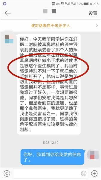 在小魚提供的與其他網(wǎng)友的聊天截圖中,還有一位自稱被仝某某猥褻過的女孩。事發(fā)時(shí),女孩還在蚌埠一所高校就讀,因?yàn)槎浼膊〉劫谀衬程幘驮\。女孩住院的時(shí)候,被仝某某用嘴接觸到了胸。如今女孩已經(jīng)到了外地,那段遭遇讓她不堪回首。