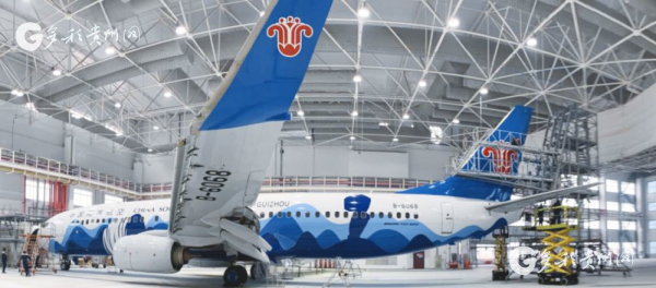 經過噴漆構型、舊涂裝褪漆、底漆上色、貼膜拉線、清漆處理、整機噴涂等多道精湛工藝和噴繪程序,備受矚目和關注的“貴州號”終于新妝飛出,成為云海中一道美麗的風景線。