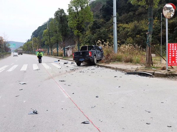 接到報警后,事故民警立即趕赴現場處置,到達現場時,發現兩輛皮卡車停在路邊,地上散落許多車輛碎片,白色皮卡車旁有明顯血跡,傷者已被送往醫。