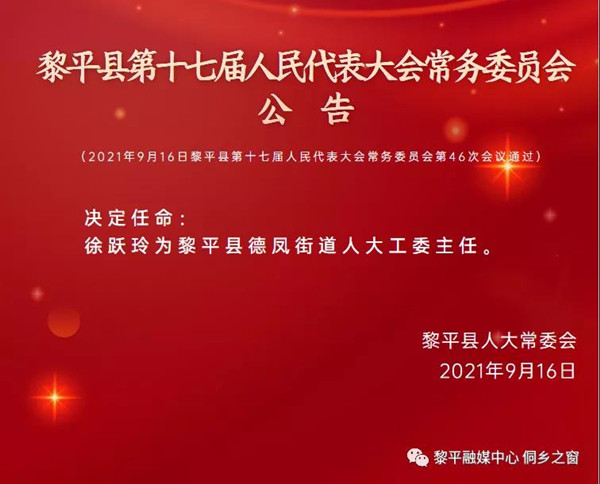 9月16日,黎平縣第十七屆人大常委會召開第46次會議,任命勞文輝為黎平縣人民政府副縣長;楊再金為黎平縣農業農村局局長;謝紹良為黎平縣鄉村振興局局長;程良遺為黎平縣水務局局長;徐躍玲為黎平縣德鳳街道人大工委主任。并頒發任命證書,舉行向憲法宣誓儀式。會議審定相關事項。