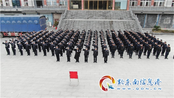 本網訊 2021年1月10日,是首個中國人民警察節,為隆重慶祝中國人民警察節,進一步堅定全警珍惜榮譽、奮勇向前、開創新的輝煌的信心決心。貴州省雷山縣公安局全體民警、輔警警容嚴整、精神煥發,整齊列隊在該局大樓前廣場,隨著主持人一聲令下,在雄壯的中國人民警察警歌歌聲中,莊嚴地向警旗敬禮,藍紅相間的警旗緩緩升起,迎風飄揚。“我志愿成為中華人民共和國人民警察……”。