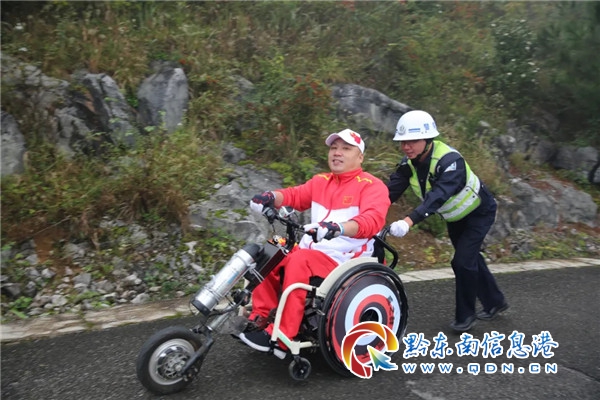 2020年10月10日,凱里市 2020“建民杯”小高山登山活動在凱里苗侗風(fēng)情園舉行。在活動現(xiàn)場,有一名特殊的選手,他坐著輪椅和其他活動選手一起“奔跑”在賽道上,活動開始后,在小高山蜿蜒的公路上,坐在輪椅上的石大哥用雙手持續(xù)給手輪圈發(fā)力,輪軸飛快轉(zhuǎn)動,雖然是坐著輪椅,但速度并不慢。當(dāng)來到距離終點(diǎn)不遠(yuǎn)處時(shí),一個(gè)坡度很大的急彎“困住”了石大哥,不但無法前行,還不能松開手,一旦往后倒退將十分危險(xiǎn)。