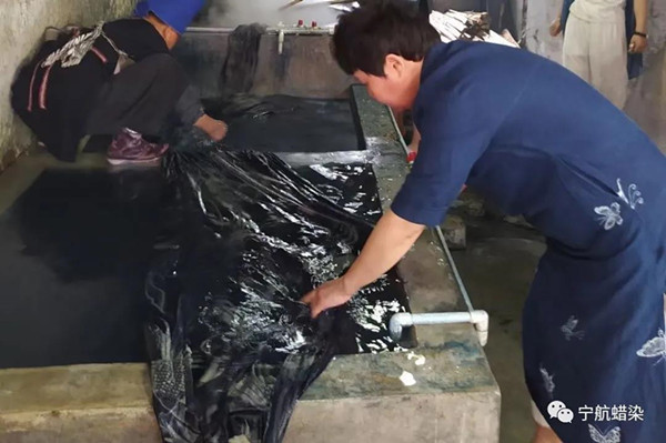 畫好的蠟染百米長卷放進(jìn)藍(lán)靛染缸里開始染色,第一次浸泡后取出晾干,便得淺藍(lán)色。再放入浸泡數(shù)次(需浸泡3-4天),最后染成深藍(lán)色,再經(jīng)過脫蠟、漂洗、晾曬等多道工序,最終完成了百米《千鳥圖》蠟染長卷。