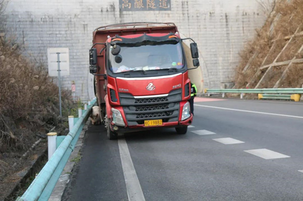 1月28日,下午17時30分左右,凱里高速公路管理處天柱路政執法大隊接到報警稱,松從高速高釀隧道內有生豬在轉悠,危及過往車輛行車安全。接到報警后,天柱路政執法大隊立即與相關部門趕赴現場處置。路政員來到現場,發現一輛載滿“二師兄”的貨車?吭谒淼莱隹谔幍木o急停車帶內,兩名男子正在和“二師兄”搏斗。經了解,兩名男子負責運送這批生豬到從江,行駛至高釀隧道時,由于貨車后方的欄柵門損壞,兩頭生豬掉落于地。