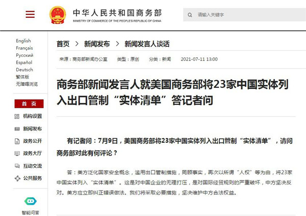 有記者問:7 月 9 日,美國商務部將 23 家中國實體列入出口管制 " 實體清單 ",請問商務部對此有何評論?