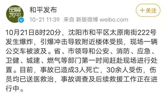 10月21日8時20分,沈陽市和平區太原南街222號發生爆炸,引爆沖擊導致附近樓體受損,現場一輛公交車被波及。省、市領導和公安、消防、應急、衛健、城建、燃氣等部門第一時間趕赴現場進行處置。目前,事故已造成3人死亡,30余人受傷,傷員均已送醫救治,事故調查及后續救援工作正在進行中。