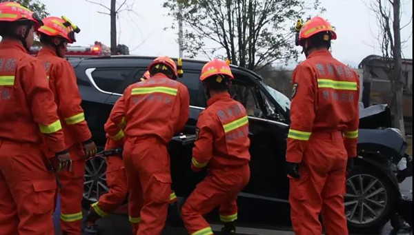 救援人員達到現場后了解到,該事故為一輛SUV追尾前方同向的重型自卸貨車尾部,SUV駕駛室向內凹陷嚴重變形,車內5人不同程度受傷,后排3名傷者已被救出送往醫院,車上還有駕駛員和副駕駛人員被困。