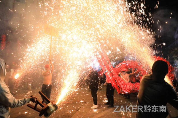 2 月 15 日晚,在臺江縣城大燈塔現場,十幾條巨龍在舞動起來,只見舞龍者高喊 " 花來了、花來了 ",噓者手持花筒蜂擁而至,點燃自己手上的花筒,發出 " 呼呼 " 的噴射聲直指龍頭、龍身 . 頓時,火光滔天,猶如波浪,一浪翻過一浪,舞龍者赤身裸背在火花四射中舉著龍燈前進,漂亮的禮花炮在上空閃耀,噓花和舞龍在追逐、比拼,驚險刺激,壯觀無比。