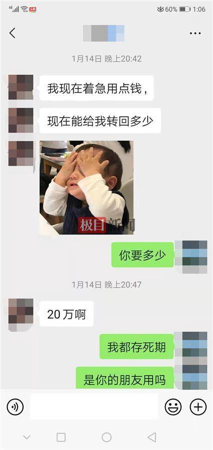 當時,父母以為王欣在杭州過年了,可2021年的五一小長假和十一長假,王欣依然沒有回家。“有時候跟她溝通少,說多了她也嫌我啰嗦。”母親張女士說,女兒很獨立,工作后也沒有向父母要一分錢。今年1月13日,一年多時間沒見女兒的張女士再次發(fā)信息讓孩子回家過年,王欣又說年前回不去。但14日晚8時42分,女兒的微信發(fā)來消息:“我現(xiàn)在著急用點錢,現(xiàn)在能給我轉多少?”隨后,對方張口要20萬元。