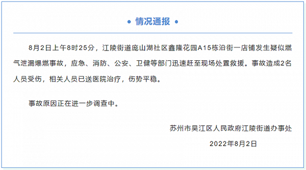 據“吳江開發區”公眾號,8月2日上午8時25分,江陵街道龐山湖社區鑫隆花園A15棟沿街一店鋪發生疑似燃氣泄漏爆燃事故,應急、消防、公安、衛健等部門迅速趕至現場處置救援。事故造成2名人員受傷,相關人員已送醫院治療,傷勢平穩。
