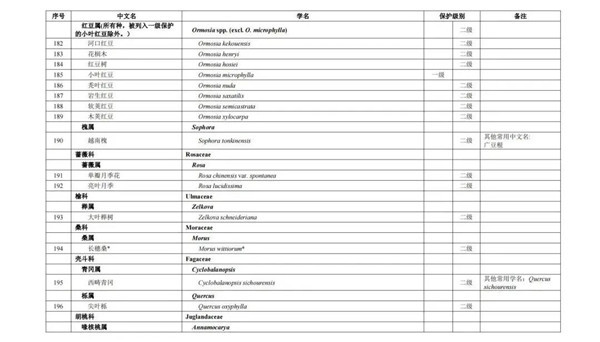 國家重點保護野生植物有85種和31類,共約241種(含變種、亞種,下同)。其中,國家一級保護植物8種4類,約22種;國家二級保護植物77種27類,約219種。歸口林業行政主管部門管理的有69種和20類,共約159種;歸口農業農村主管部門管理的有16種和11類,約82種。