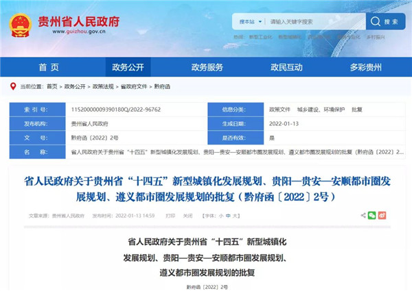 你委《關于請予審批貴州省“十四五”新型城鎮化、貴陽—貴安—安順都市圈、遵義都市圈發展規劃的請示》(黔發改呈〔2021〕995號)收悉。經研究,現批復如下: