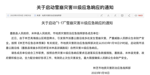 據林芝市人民政府網站消息,林芝市地質災害防治應急指揮部發布《關于啟動“1·17”雪崩災害Ⅲ級應急響應的通知》,決定從2023年1月18日21時起,啟動林芝市派墨公路沿線(墨脫縣背崩鄉阿尼橋至米林縣派鎮路段)自然災害Ⅲ級應急響應。