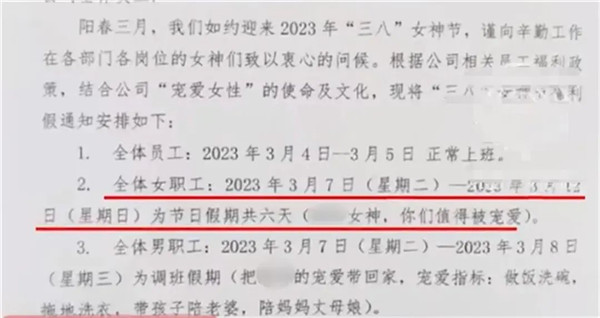 網友發布了一家重慶的餐飲管理公司的放假通知。通知中稱,在迎來三八婦女節期間,“根據公司相關員工福利政策,結合公司‘寵愛女性’的使命及文化,安排放假。”全體女性職工3月7日至3月12日放假,共計6天,并寫道“女神你們值得被寵愛。”同時,該公司也為男性職工提供了假期,男性職工3月7日至8日為調班假期,可以帶孩子、陪老婆、陪媽媽和丈母娘。同時也標注,請相關負責人提前安排調班事宜,假期以不影響工作開展為前提。