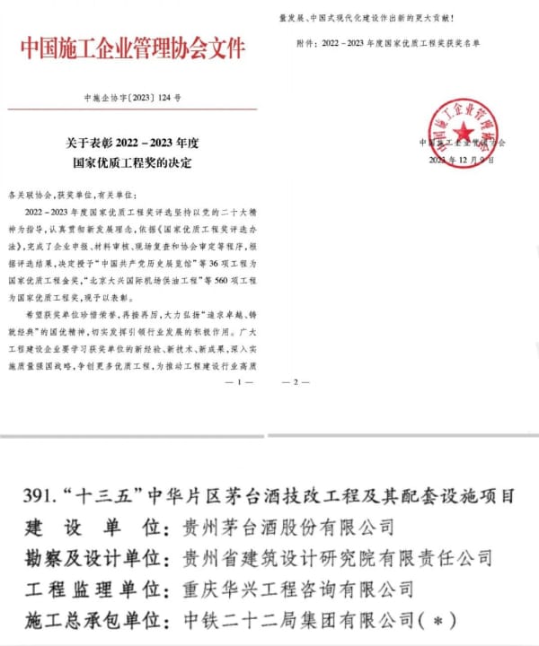 近日,中國施工企業(yè)管理協(xié)會發(fā)布了《關(guān)于表彰2022-2023年度國家優(yōu)質(zhì)工程獎的決定》,“十三五”中華片區(qū)茅臺酒技改工程及其配套設(shè)施項目榮獲“國家優(yōu)質(zhì)工程獎”。