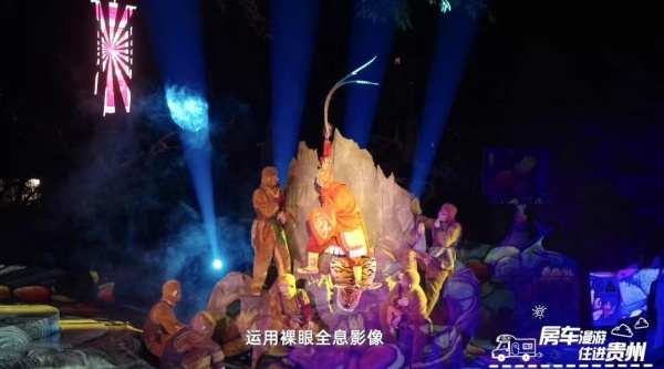 真正的高潮在瀑布腳下上演。名為“水云天瀑”的燈光秀徹底重塑了瀑布的形態。光影如巨筆,在瀑面上繪出《西游記》的瑰麗篇章:唐僧師徒取經歸來的場景、女兒國的旖旎風情……3D裸眼全息影像讓瀑布化身天幕,真人演員穿梭其間,我們仿佛親歷那場宏大史詩。這是科技與自然共譜的視覺交響詩,是與白日截然不同的震撼。