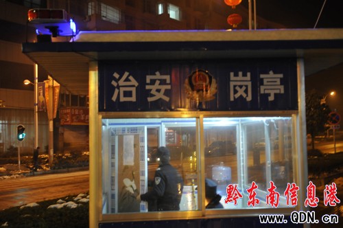1月22日,在岑鞏縣城區看到,各重要路口都建起了治安崗亭,廣大市民增加了安全感,夜間出行更加放心了。