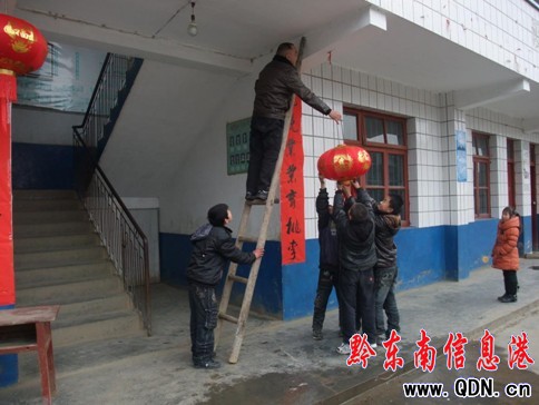 1月31日,記者在岑鞏縣羊橋土家族鄉龍坪希望小學看到,校園里張燈結彩,掛起了紅燈籠,貼上了對聯。歡聲笑語中,20多名留守孩子正在那里歡慶新年。