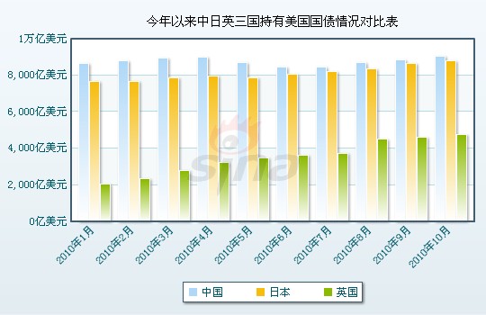 數據還顯示,截至2010年10月底,日本和英國依然不同程度增持美國國債,日本增持128億美元達到8774億美元,英國增持186億美元,依然位列二三位。
