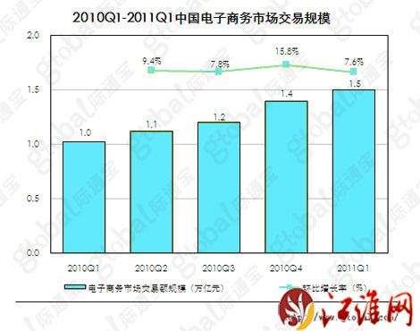 江淮網訊:隨著互聯網應用創新的迅猛推進,電子商務已成為我國“十一五”期間發展最快、影響最廣泛的互聯網應用之一,并被列入“十二五”規劃國家戰略性新興產業的重要組成部分。際通寶數據顯示,2011年第一季度我國電子商務市場整體交易規模達1.5萬億元,環比增長7.6%。
