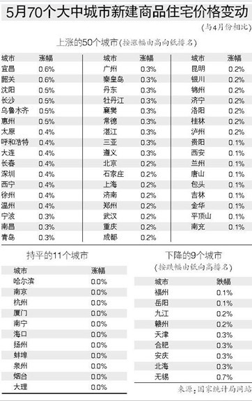 與去年同月相比,70個大中城市中,新建商品住宅價格下降的城市有3個,分別是杭州、三亞、南充;漲幅回落的城市有36個。5月份新建商品住宅價格同比(比上年同期)漲幅在5%以內的城市有36個,比4月份增加了7個。