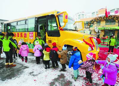 12月10日,小朋友排隊乘坐“大鼻子”仿美式校車。當日,山東省煙臺市福山區康樂幼兒園一輛“大鼻子”仿美式校車正式投入使用。這款校車在造型上借鑒了歐美校車的長頭設計,配備有GPRS定位系統、專用停車信號臂、學童專用座椅、前部補盲鏡等,提高了校車的安全性。初陽攝(新華社發)