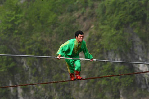 在2008年挑戰失敗后,新疆“達瓦孜”第七代年輕傳人賽買提·艾山25日再次向張家界天門山世界最大坡度的高空鋼絲發起挑戰。經過1小時7分鐘的艱難行走,賽買提·艾山最終挑戰成功。