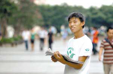 昨日,云陽小伙杜萬軍在觀音橋義賣報紙,對未來充滿希望。