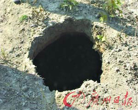《廣州日報》消息 “韶關市曲江區一塊豆田突然出現奇怪下陷”。昨天上午,記者在現場看到,一個深約10米的深洞赫然出現在田間(見下圖),幸未造成人畜傷亡。