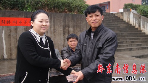 3月27日,受北京市氣象局藍天基金會的委托,團丹寨縣委副書記洪萍一行在丹寨縣排調鎮團委及相關部門負責人的陪同下,將其藍天基金籌集到的第一筆愛心款25085元送到排調小學,現場發放第一筆貧困助學金。