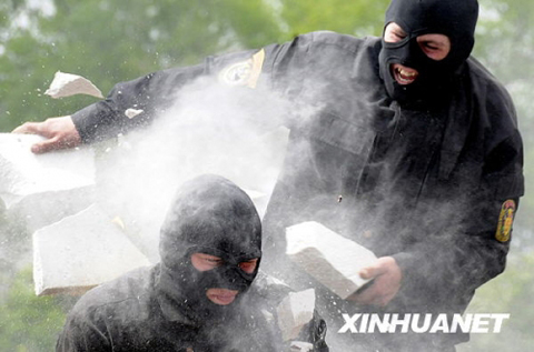 5月19日,在白俄羅斯首都明斯克舉行的第五屆國際武器裝備和軍事技術展“米列克斯-2009”開幕式上,白俄羅斯特種部隊隊員表演頭頂碎石。為期四天的第五屆國際武器裝備和軍事技術展吸引了來自約40個國家的軍方代表團和企業參加。