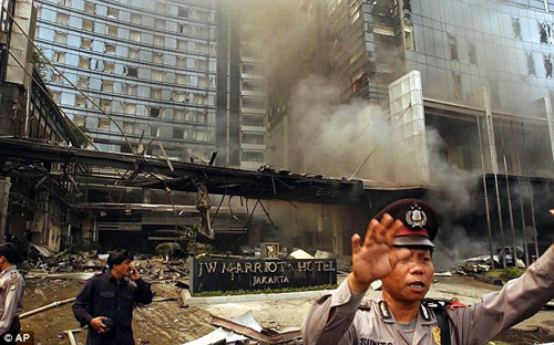 印尼警方說,第一次爆炸發生在萬豪酒店的餐廳,當場造成6人死亡。3分鐘后在麗思卡爾頓酒店餐廳發生類似爆炸,當場造成2人死亡。巨大的爆炸聲和滾滾煙霧令周邊民眾震驚,紛紛跑出室外。在爆炸事件中傷亡的近20名外國人分別來自澳大利亞、新西蘭、印度、韓國、荷蘭、挪威和加拿大等國。