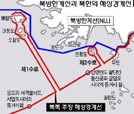朝韓海上分界線爭議示意圖,其中藍線為NLL(北方界線),紅線為朝鮮主張的警戒線