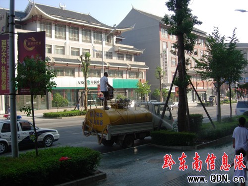 劍河縣為打造山水園林旅游縣城,今年投入270萬元對縣城主干道兩旁新栽種300多棵胸徑在35厘米,7.5米高的香樟樹。持續久旱無雨,為確保新栽種的香樟樹成活,該縣動用消防車及綠化澆水專用車堅持早、晚巡回為300多棵香樟樹澆水解“渴”。(石慶偉)