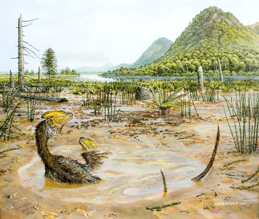 這幅繪畫作品展示了大約1.6億年前侏羅紀晚期的中國新疆地區(qū),畫中的兩只食肉恐龍五彩冠龍在一個泥濘的深坑中苦苦掙扎。五彩冠龍是一種小型獸腳亞目食肉恐龍,它們是一種兩足猛禽家族成員,繼承了包括霸王龍在內(nèi)的恐龍血統(tǒng)。
