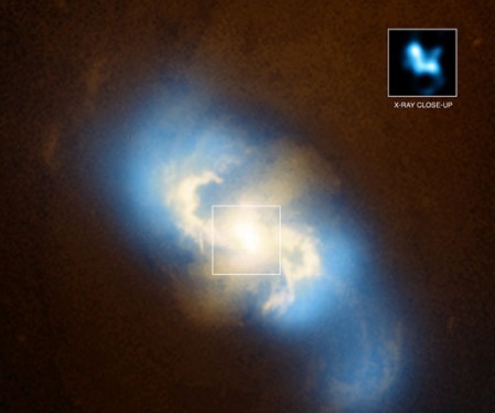 通常,隨著星系之間的碰撞,還會發(fā)生戲劇性的結(jié)果,比如星系“NGC6240”和星系“Mrk 463”,都是大型星系合并的結(jié)果,也從側(cè)面描繪出了合并后星系被破壞的形狀,同時,在合并后星系的核心旁還形成了許多新星。但與此相反,在這次發(fā)現(xiàn)的大型星系合并后的產(chǎn)物中,卻發(fā)現(xiàn)了一個有規(guī)律的螺旋形狀星云,且與銀河系的形狀十分相似,且這個星系的核心旁也沒有新星的形成,看起來這兩個星系的合并并未擾亂任何事情。這也就解釋了,為何星系之間的吞并在宇宙中經(jīng)常出現(xiàn),但科學家卻很難見到。就是因為,大型星系的合并也許對更大星系的合并并不會造成太大干擾,所以,我們很難見到星系碰撞時發(fā)出的光波長,甚至這次看到的X射線,也僅僅是在兩個黑洞同時存在于一個星系中心處才發(fā)現(xiàn)的。如果這兩個黑洞不是因同時吞噬行星而一起發(fā)光,科學家也就不能夠發(fā)現(xiàn)它們了。(尚力)