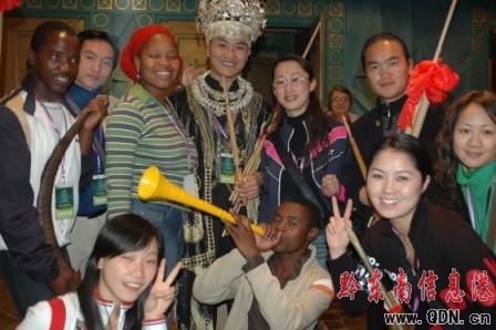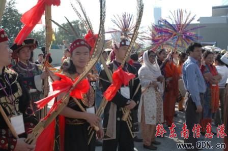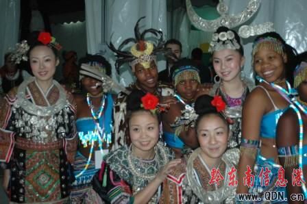 這是一個多國家、各種民族、各種文化互相交融展示的大舞臺,身著盛裝的苗族姑娘們一亮相就備受觀眾和媒體的關注。蘆笙響,歌舞起,錦雞飛,苗族姑娘、小伙子們?yōu)榘拈T同胞和外國友人送上了一頓豐盛的苗族文化大餐。