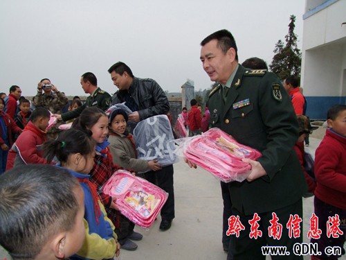 12月28日,凱里市人武部組織干部職工到扶貧聯系點旁海鎮聯鞏村開展“扶貧助學送溫暖”慰問活動,為村委送去一套辦公桌椅,為希望小學200多名學生每人送去了一個書包和部分學習用品,還為9名老師每人贈送軍用冬常服一套,深受廣大師生們的歡迎。圖為人武部部長謝龍春、政委焦勇為學生們贈送書包時的情景。(楊再金)