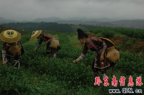 黎平縣是貴州茶園較集中連片的大茶區(qū)之一,茶園面積居黔東南之首,全縣已建成茶葉10.68萬(wàn)畝,其中幼齡茶園3萬(wàn)畝,投產(chǎn)茶園5.68萬(wàn)畝。主要品種是龍井43號(hào)等四大品種,無(wú)性系品種占總數(shù)的85.9%。2010年茶葉總產(chǎn)量達(dá)2600噸,茶葉總產(chǎn)值2億元,分別比2009年增產(chǎn)240噸和增收1680萬(wàn)元,受益3.2萬(wàn)農(nóng)戶(hù),群眾增收9000萬(wàn)元,解決農(nóng)村8至9萬(wàn)農(nóng)村勞力就業(yè)。圖為侗族姑娘們?cè)诓鑸@里一邊唱歌,一邊摘茶的情形。(陸書(shū)明 攝影報(bào)道)