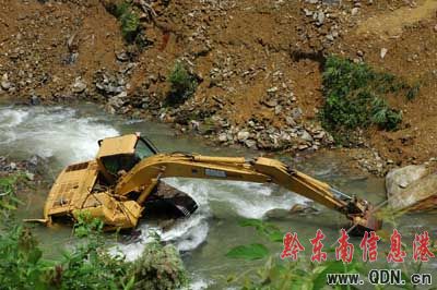 昨日(3日)拍攝困在河中的挖掘機。據介紹,6月25日上午,因突降暴雨,在雷山縣永樂鎮開屯村河中,一臺正在為某建筑工地清理廢棄土石方的挖掘機突然遭遇洪水襲擊,致一名17歲駕駛員在挖掘機上被洪水卷走。直到7月2日,搜尋人員才在下游100多公里外的榕江縣境內找到死者尸體。(吳興權 攝)