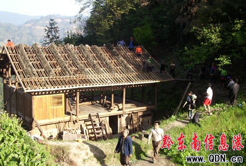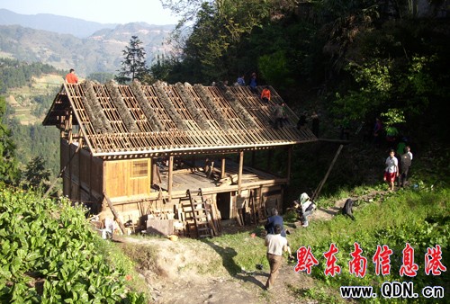 本港訊 (特約記者 侯天智 攝影報道)近兩年來,雷山縣積極實施“農村危房改造”工程,不僅解決了農村農民住房難的問題,還助推了該縣的新農村建設,收效良好。圖為雷山縣大塘鄉地處海拔1500米高坡上的排里村村民在傳遞瓦片進行危房改造的情景。