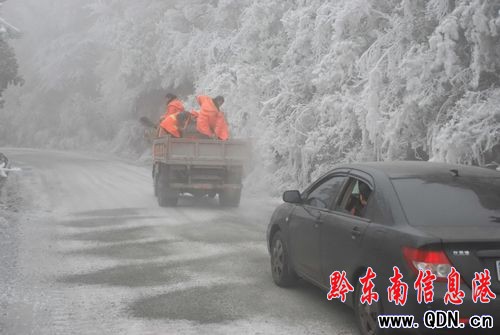 2011年1月2日至8日,雷山公路管理段組織路政、公路養護人員40多組成人“除冰保暢突擊隊”,每天在全州海拔最高的308省排里坳路段(海拔1500多米)196公里至206公里處撒鹽化冰、撒沙防滑,于8日下午打通了該路段。至止,黔東南州已經有16條國、省、縣干線、旅游公路得到了通行或緩行,僅剩省道202線天柱縣高釀至錦屏路段正在除冰中。(楊政武 張榮 特約記者 陳沛亮攝)