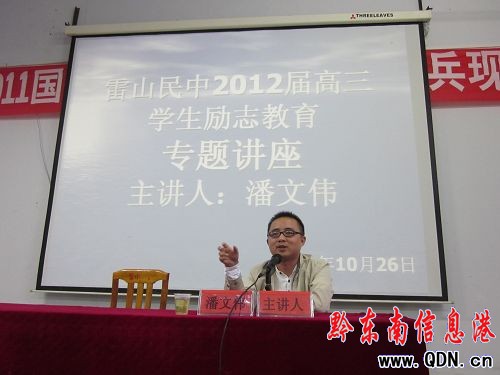 為激發2012屆高三學生樹雄心為國讀書,立壯志志在高考,10月26日下午,雷山民族中學請來校友潘文偉先生進行勵志教育宣講。